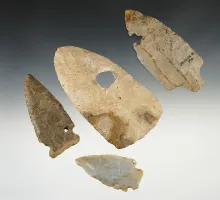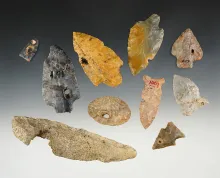 Set of 10 assorted Midwestern points and knives with naturally eroded holes in the material. | 45.00 | ||