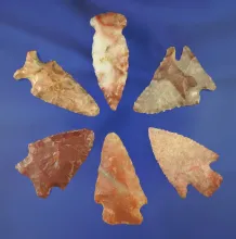 Set of six assorted Midwestern arrowheads, largest is 2 1/16". Some nice color in this group. |