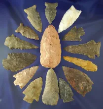 Group of 15 assorted Midwestern arrowheads, most in very nice condition. Largest is 3 3/16". 75.00