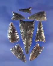 Set of eight Obsidian arrowheads found in the Great Basin region, largest is 1 13/16". |