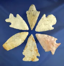 Group of six Midwestern U.S. Arrowheads, largest is 2 1/16". |
