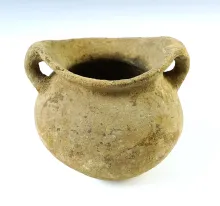 3 7/8" wide by 3 3/8" tall Handled Miniature Olla in solid condition. |