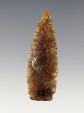 Parallel flaked 2 1/16" Paleo Lanceolate with slight side notches. Made from Knife River Flint. |