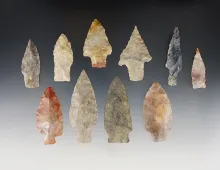 Set of 10 assorted Stemmed points from various locations. The largest is 2 9/16". |
