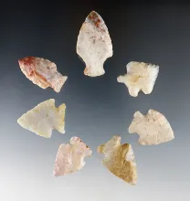 Set of 7 nicely colored Flint Ridge points found in various Ohio counties. Largest is 1 3/4". |