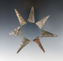 Set of 7 well flaked and nicely styled Ohio Triangle Points. The largest is 1 5/8". OHIO 55.00