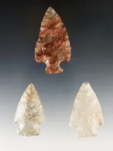 Set of 3 nicely made Flint Ridge Points. The red Bottleneck is broken and glued. Licking Co., Ohio. |