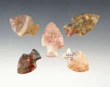 Set of 5 highly colorful Flint Ridge points found in Ohio. The largest is 1 11/16". |