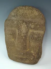Carved stone face that measures 7" by 5 1/8" from the formative Mayan. Circa 1000 BC. |