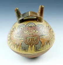 6" Wide x 7" Tall Sican Strap Handle Bottle with a monkey effigy, found in Peru. 140.00