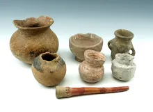 Set of 6 Miniature Pre-Columbian pottery vessels and a repaired pipe. Largest vessel is 4 1/4" wide. |