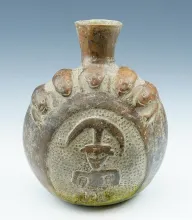 5 3/4" by 3 1/4" rare coastal Huari Effigy Bottle that is nicely painted. |