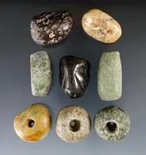 Set of eight nicely polished assorted Pre-Columbian stone beads, one has a human face effigy on it. |