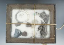 Early 1900's original frame of Ft. Ancient relics including shell, pendants, triangle points, Ohio. |