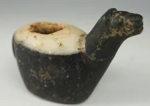 3 3/8" Heavily patinated llama Canopa found in Peru. Made from semi translucent material. |