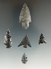Set of five assorted points found in the Willamette Valley, Oregon. Largest is 1 1/2". Ex. Jim Hogue |