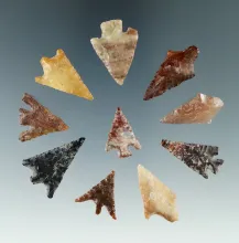 Group of 10 Columbia River arrowheads found by Norma Berg in Washington, largest is 1 1/8". WASHINGTON 130.00