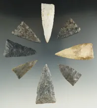 Group of 8 triangle points found at the Fox Field site in Mason County Kentucky. Largest is 2 3/16". |
