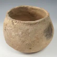 4 3/4" wide by 3 5/8" tall pottery vessel with a restored probe hole - Kentucky. |