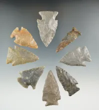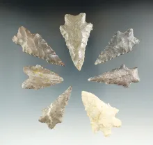 Set of eight assorted Kentucky arrowheads, largest is 1 7/8". Ex. Henry English collection. KENTUCKY 130.00