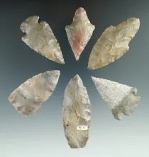 Set of six assorted Illinois arrowheads, largest is 2 9/16". ILLINOIS 70.00