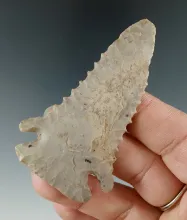 2 3/4" Pinetree with nice edge serrations. Found by J. Bond in 1967 in Fayette Co., Kentucky. |