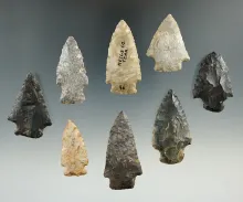 Set of eight assorted points found in Tennessee, largest is 2 1/16". |