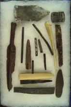 Nice artifact group recovered by the Columbia River, including bone, copper, tube beads,trade items. |