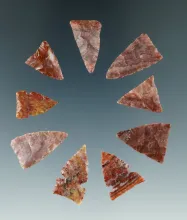 Set of nine arrowheads found in Texas made from attractive materials, largest is 3/4". | TEXAS | 150.00 | |