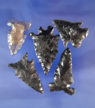 Set of five Obsidian arrowheads found in Oregon, largest is 1 3/16". |
