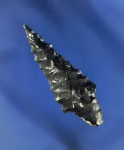 Nicely serrated 1 3/4" Obsidian Rabbit Island dart point found near Crump Lake Oregon. OREGON