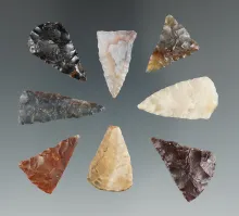 Group of eight nicely flaked triangle and leaf points found near Vantage Washington, Columbia River. |