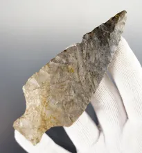 2 3/16" Archaic Thebes Bevel made from patinated Coshocton Flint. Found in Ohio. OHIO 110.00