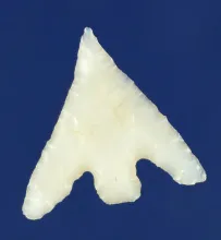 2 7/16" heavily patinated Obsidian Cornernotch that is thin with good flaking, has a slight curve. |