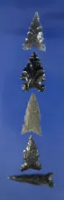 Set of five Obsidian arrowheads found in Oregon and Nevada, largest is 1 3/16". |