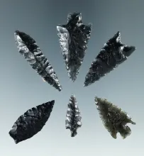 Set of six Obsidian arrowheads found in Oregon, largest is 1 5/8". |