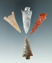 Group of four Columbia River arrowheads found by Norma Berg, largest is 1 13/16". |
