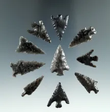 Group of ten small Obsidian Points, longest is 1 1/8", found in the Great Basin, Oregon. |