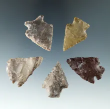 Set of five assorted Columbia River arrowheads, largest is 1 5/16". |