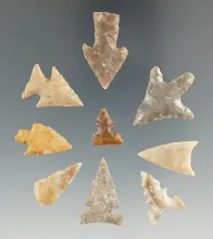 Group of nine assorted Texas Bird Points, largest is 1". |