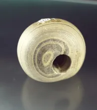 1 13/16" Fluted Ball Bannerstone - Delaware Co., IN.. Ex. Earl Townsend, Charlie Smith - Pictured. |