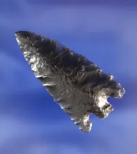1 7/8" Obsidian Basal Notch that is well flaked. Found in Paradise Valley, Idaho. Ex. Chris Craft. |