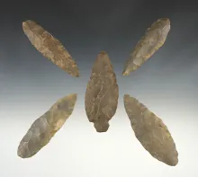 Set of 5 Hornstone Blades and points found in Peru, Indiana. The largest is 3 9/16". |