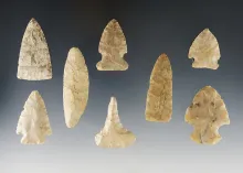 Set of 8 well made Indiana points in good condition. The largest is 2 5/8". |