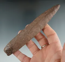 3 15/16" early Archaic stemmed knife with heavily ground stem edges found in Michigan. |