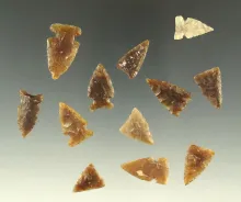 Set of 12 assorted arrowheads found in the Dakotas area, largest is 15/16". |