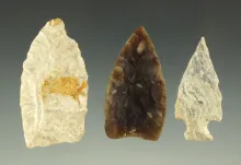 Set of three heavily patinated arrowheads found in the Dakotas area, largest is 1 5/8". |