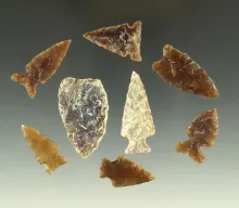 Set of eight arrowheads made from Knife River Flint found in the Dakotas. |