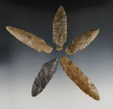 Set of 5 well made Triangle Points found in the Kentucky/Tennessee area. The largest is 1 7/16". |