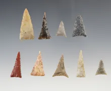 Set of 9 nice Triangle Points found in the Kentucky/Tennessee area. The largest is 1 7/8". |